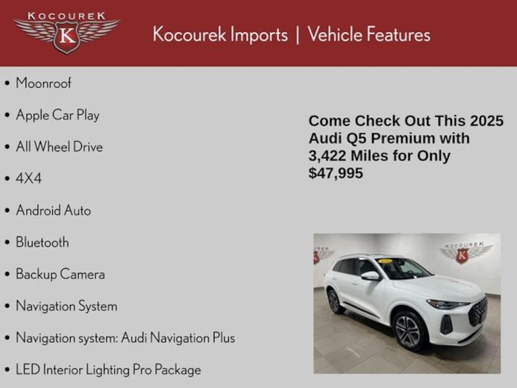 Moonroof, Apple Car Play, All Wheel Drive, 4X4, Android Auto, Bluetooth, Backup Camera, Q5 2.0T Premium Plus quattro, 4D Sport Utility, 2.0L 4-Cylinder TFSI, 7-Speed Automatic S tronic, quattro, White, Black Leather, 10 Speakers, 4-Wheel Disc Brakes, ABS brakes, Adaptive Cruise Assist, Air Conditioning, Alloy wheels, Animation For Headlights and Taillights, Auto High-beam Headlights, Auto tilt-away steering wheel, Auto-dimming Rear-View mirror, Automatic temperature control, Bang & Olufsen Sound System with 3D Sound, Brake assist, Compass, Delay-off headlights, Driver door bin, Driver vanity mirror, Dual front impact airbags, Dual front side impact airbags, Dynamic Interaction Light, Electronic Stability Control, Emergency communication system: Audi connect CARE, Exterior Parking Camera Rear, Four wheel independent suspension, Front anti-roll bar, Front dual zone A/C, Front fog lights, Front reading lights, Garage door transmitter: HomeLink, Genuine wood console insert, Genuine wood dashboard insert, Genuine wood door panel insert, Head-Up Display, Headlight Washers, Heated door mirrors, Heated Front Bucket Seats, Heated front seats, Heated Steering Wheel with Hands-on Detection, Illuminated entry, LED Headlights Plus with Digital DRL, LED Interior Lighting Pro Package, Low tire pressure warning, Memory seat, Navigation System, Navigation system: Audi Navigation Plus, Occupant sensing airbag, Outside temperature display, Overhead airbag, Overhead console, Panic alarm, Panoramic Sunroof, Passenger vanity mirror, Power driver seat, Power Liftgate, Power steering, Power windows, Premium Plus, Radio data system, Radio: MMI Navigation Plus, Rain sensing wipers, Rear air conditioning, Rear anti-roll bar, Rear reading lights, Rear seat center armrest, Rear window defroster, Rear window wiper, Remote keyless entry, Security system, Speed-sensing steering, Speed-Sensitive Wipers, Steering wheel mounted audio controls, Top View Camera System, Traction control, USB Power Delivery (2x60W Front and 2x100W Rear), Variably intermittent wipers, Wheels: 18" 5-Arm-Twist Design, Wheels: 19" 5-Double-Spoke Design, Auto-dimming door mirrors, Bumpers: body-color, Front Bucket Seats, Front Center Armrest, Leather Seating Surfaces, Leather steering wheel, Passenger door bin, Power door mirrors, Power passenger seat, Rear fog lights, Roof rack, Speed control, Split folding rear seat, Spoiler, Tachometer, Telescoping steering wheel, Tilt steering wheel, Trip computer, Turn signal indicator mirrors, Q5 2.0T Premium Plus quattro, 4D Sport Utility, 2.0L 4-Cylinder TFSI, 7-Speed Automatic S tronic, quattro, White, Black Leather, 10 Speakers, 4-Wheel Disc Brakes, ABS brakes, Adaptive Cruise Assist, Air Conditioning, Alloy wheels, Animation For Headlights and Taillights, Auto High-beam Headlights, Auto tilt-away steering wheel, Auto-dimming Rear-View mirror, Automatic temperature control, Bang & Olufsen Sound System with 3D Sound, Brake assist, Compass, Delay-off headlights, Driver door bin, Driver vanity mirror, Dual front impact airbags, Dual front side impact airbags, Dynamic Interaction Light, Electronic Stability Control, Emergency communication system: Audi connect CARE, Exterior Parking Camera Rear, Four wheel independent suspension, Front anti-roll bar, Front dual zone A/C, Front fog lights, Front reading lights, Garage door transmitter: HomeLink, Genuine wood console insert, Genuine wood dashboard insert, Genuine wood door panel insert, Head-Up Display, Headlight Washers, Heated door mirrors, Heated Front Bucket Seats, Heated front seats, Heated Steering Wheel with Hands-on Detection, Illuminated entry, LED Headlights Plus with Digital DRL, LED Interior Lighting Pro Package, Low tire pressure warning, Memory seat, Navigation System, Navigation system: Audi Navigation Plus, Occupant sensing airbag, Outside temperature display, Overhead airbag, Overhead console, Panic alarm, Panoramic Sunroof, Passenger vanity mirror, Power driver seat, Power Liftgate