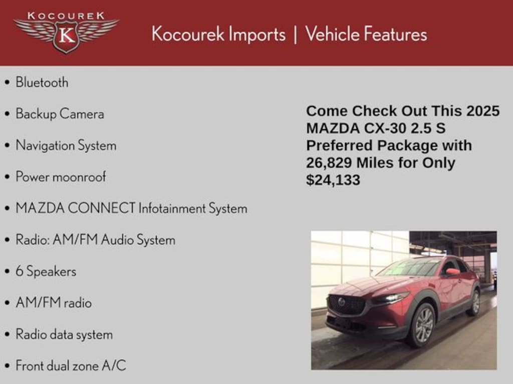 Please call one of our knowledgeable Sales Consultants with any question you might have. Serving guests in Marathon, Portage, Langlade, Oneida, Taylor, Vilias, Wood, Clark, Lincoln, Waupaca or near me! 2025 Mazda CX-30 2.5 S Preferred Package