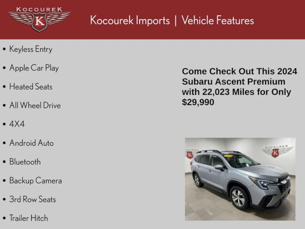 Keyless Entry, Apple Car Play, Heated Seats, All Wheel Drive, 4X4, Android Auto, Bluetooth, Backup Camera, 3rd Row Seats, Trailer Hitch, Tow Package, Trailer Package, Portable Audio Connection, Multi-zone Climate Control, 3rd row seats: bench, 3rd Row Sunshade, 4-Wheel Disc Brakes, 6 Speakers, ABS brakes, Air Conditioning, All-Weather Floor Liners, Alloy wheels, AM/FM radio: SiriusXM, Auto High-beam Headlights, Auto-Dimming Rear View Compass Mirror w/HomeLink, Automatic temperature control, Axle Ratio: 4.44, Brake assist, Bumpers: body-color, Cargo Tray, Convenience Package, Delay-off headlights, Driver door bin, Driver vanity mirror, Dual front impact airbags, Dual front side impact airbags, Electronic Stability Control, Emergency communication system: STARLINK Safety and Security (Subscription Required), Exterior Parking Camera Rear, Four wheel independent suspension, Front anti-roll bar, Front Bucket Seats, Front Center Armrest, Front dual zone A/C, Front reading lights, Fully automatic headlights, Heated door mirrors, Heated Front Bucket Seats, Heated front seats, Illuminated entry, Keyless Access w/Push-Button Start, Knee airbag, Leather Shift Knob, Leather steering wheel, Low tire pressure warning, Occupant sensing airbag, Outside temperature display, Overhead airbag, Overhead console, Panic alarm, Passenger door bin, Passenger vanity mirror, Power door mirrors, Power driver seat, Power Rear Gate w/Automatic Close & Height Memory, Power steering, Power windows, Radio data system, Radio: Subaru STARLINK 11.6" Multimedia Plus System, Rear air conditioning, Rear anti-roll bar, Rear reading lights, Rear window defroster, Rear window wiper, Reclining 3rd row seat, Remote keyless entry, Reverse Automatic Braking (RAB) System, Security system, Side Sill Plates, Speed control, Speed-sensing steering, Spill Resistant Coated Cloth Upholstery, Split folding rear seat, Spoiler, STARLINK/Apple CarPlay/Android Auto, Steering wheel mounted audio controls, Tachometer, Telescoping steering wheel, Tilt steering wheel, Traction control, Trip computer, Turn signal indicator mirrors, Variably intermittent wipers, Wheels: 18" x 7.5 J Gray Alloy w/Machine Finish, Windshield Sunshade, 3rd row seats: bench, 3rd Row Sunshade, 4-Wheel Disc Brakes, 6 Speakers, ABS brakes, Air Conditioning, All-Weather Floor Liners, Alloy wheels, AM/FM radio: SiriusXM, Auto High-beam Headlights, Auto-Dimming Rear View Compass Mirror w/HomeLink, Automatic temperature control, Axle Ratio: 4.44, Brake assist, Bumpers: body-color, Cargo Tray, Convenience Package, Delay-off headlights, Driver door bin, Driver vanity mirror, Dual front impact airbags, Dual front side impact airbags, Electronic Stability Control, Emergency communication system: STARLINK Safety and Security (Subscription Required), Exterior Parking Camera Rear, Four wheel independent suspension, Front anti-roll bar, Front Bucket Seats, Front Center Armrest, Front dual zone A/C, Front reading lights, Fully automatic headlights, Heated door mirrors, Heated Front Bucket Seats, Heated front seats, Illuminated entry, Keyless Access w/Push-Button Start, Knee airbag, Leather Shift Knob, Leather steering wheel, Low tire pressure warning, Occupant sensing airbag, Outside temperature display, Overhead airbag, Overhead console, Panic alarm, Passenger door bin, Passenger vanity mirror, Power door mirrors, Power driver seat, Power Rear Gate w/Automatic Close & Height Memory, Power steering, Power windows, Radio data system, Radio: Subaru STARLINK 11.6" Multimedia Plus System, Rear air conditioning, Rear anti-roll bar, Rear reading lights, Rear window defroster, Rear window wiper, Reclining 3rd row seat, Remote keyless entry, Reverse Automatic Braking (RAB) System, Security system, Side Sill Plates, Speed control, Speed-sensing steering, Spill Resistant Coated Cloth Upholstery, Split folding rear seat, Spoiler, STARLINK/Apple CarPlay/Android Auto, Steering wheel mounted audio controls, Tachometer, Telescoping steering wh