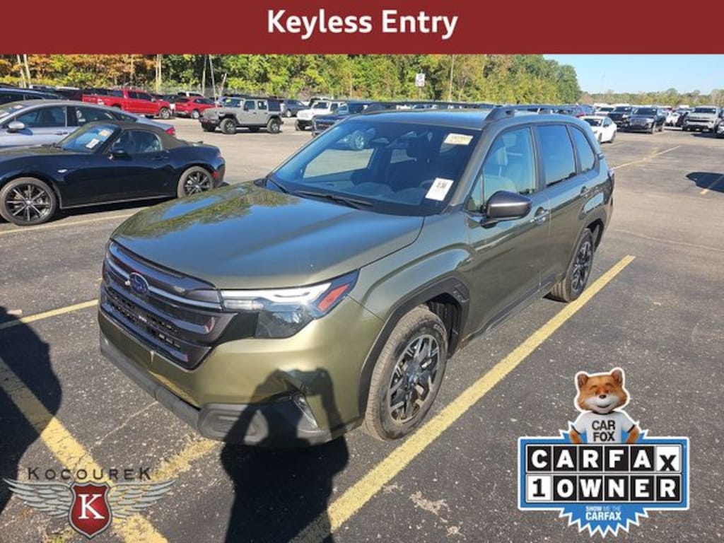 Keyless Entry, Remote Start, All Wheel Drive, 4X4, Heated Seats, Leather Seats, Apple Car Play, Android Auto, Moonroof, Tow Package, Trailer Package, Bluetooth, Portable Audio Connection, Backup Camera, Multi-zone Climate Control, Forester Premium, 4D Sport Utility, 2.5L 4-Cylinder DOHC 16V, Lineartronic CVT, AWD, Autumn Green Metallic, Black Cloth, 4-Wheel Disc Brakes, ABS brakes, All-Weather Floor Liners, Anti-whiplash front head restraints, Auto-Dimming Mirror w/Compass & HomeLink, Automatic Emergency Steering, Automatic temperature control, Blind-Spot Detection (BSD)/RCTA System, Brake assist, Cargo Tray, Convenience Package #1, Driver door bin, Driver vanity mirror, Dual front impact airbags, Dual front side impact airbags, Electronic Stability Control, Emergency communication system: MySubaru Safety (3-year free trial), Exterior Parking Camera Rear, Four wheel independent suspension, Front anti-roll bar, Front Bucket Seats, Front Center Armrest, Front dual zone A/C, Front reading lights, Heated Front Bucket Seats, Heated front seats, Illuminated entry, Knee airbag, Leather steering wheel, LED Upgrade, Low tire pressure warning, Outside temperature display, Overhead console, Passenger vanity mirror, Power door mirrors, Power driver seat, Power moonroof: Panoramic, Power Rear Gate, Power Rear Gate & Blind Spot Detection w/RCTA, Power steering, Power windows, Premium Textured Cloth Upholstery, Radio: Subaru 11.6" Multimedia Plus System, Rear Bumper Cover, Remote keyless entry, Security system, Speed control, Speed-sensing steering, Spoiler, Steering wheel mounted audio controls, Tachometer, Tilt steering wheel, Traction control, 6 Speakers, Air Conditioning, Alloy wheels, AM/FM radio: SiriusXM with 360L, Auto High-beam Headlights, Bumpers: body-color, Front fog lights, Fully automatic headlights, Heated door mirrors, Occupant sensing airbag, Overhead airbag, Panic alarm, Passenger door bin, Radio data system, Rear anti-roll bar, Rear seat center armrest, Rear window defroster, Rear window wiper, Split folding rear seat, Telescoping steering wheel, Trip computer, Variably intermittent wipers, Wheels: 17" x 7.0 J Dark Metallic Aluminum-Alloy, Forester Premium, 4D Sport Utility, 2.5L 4-Cylinder DOHC 16V, Lineartronic CVT, AWD, Autumn Green Metallic, Black Cloth, 4-Wheel Disc Brakes, ABS brakes, All-Weather Floor Liners, Anti-whiplash front head restraints, Auto-Dimming Mirror w/Compass & HomeLink, Automatic Emergency Steering, Automatic temperature control, Blind-Spot Detection (BSD)/RCTA System, Brake assist, Cargo Tray, Convenience Package #1, Driver door bin, Driver vanity mirror, Dual front impact airbags, Dual front side impact airbags, Electronic Stability Control, Emergency communication system: MySubaru Safety (3-year free trial), Exterior Parking Camera Rear, Four wheel independent suspension, Front anti-roll bar, Front Bucket Seats, Front Center Armrest, Front dual zone A/C, Front reading lights, Heated Front Bucket Seats, Heated front seats, Illuminated entry, Knee airbag, Leather steering wheel, LED Upgrade, Low tire pressure warning, Outside temperature display, Overhead console, Passenger vanity mirror, Power door mirrors, Power driver seat, Power moonroof: Panoramic, Power Rear Gate, Power Rear Gate & Blind Spot Detection w/RCTA, Power steering, Power windows, Premium Textured Cloth Upholstery, Radio: Subaru 11.6" Multimedia Plus System, Rear Bumper Cover, Remote keyless entry, Security system, Speed control, Speed-sensing steering, Spoiler, Steering wheel mounted audio controls, Tachometer, Tilt steering wheel, Traction control.
